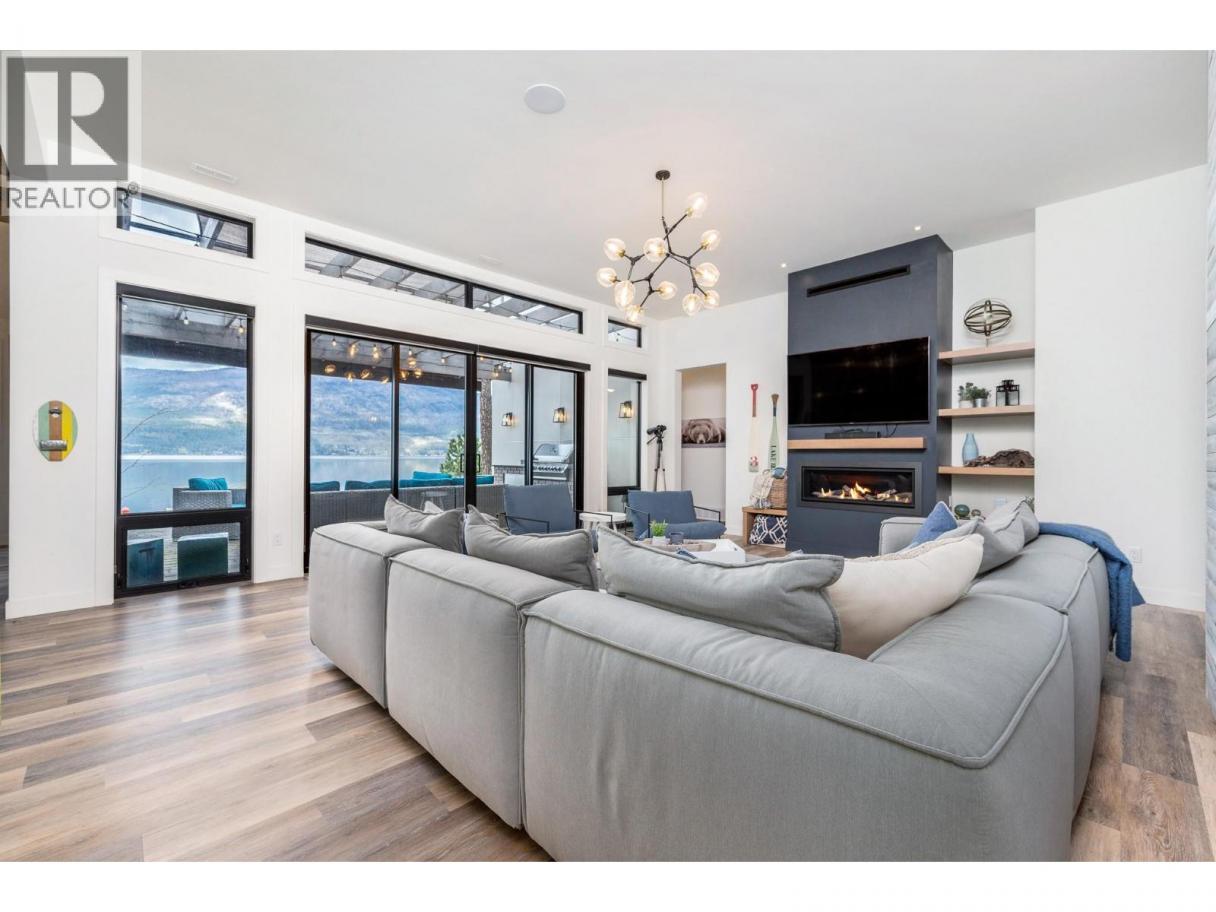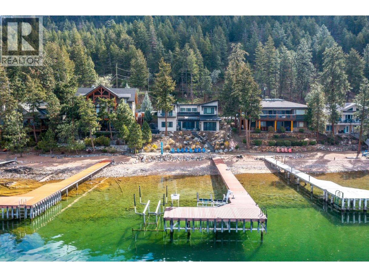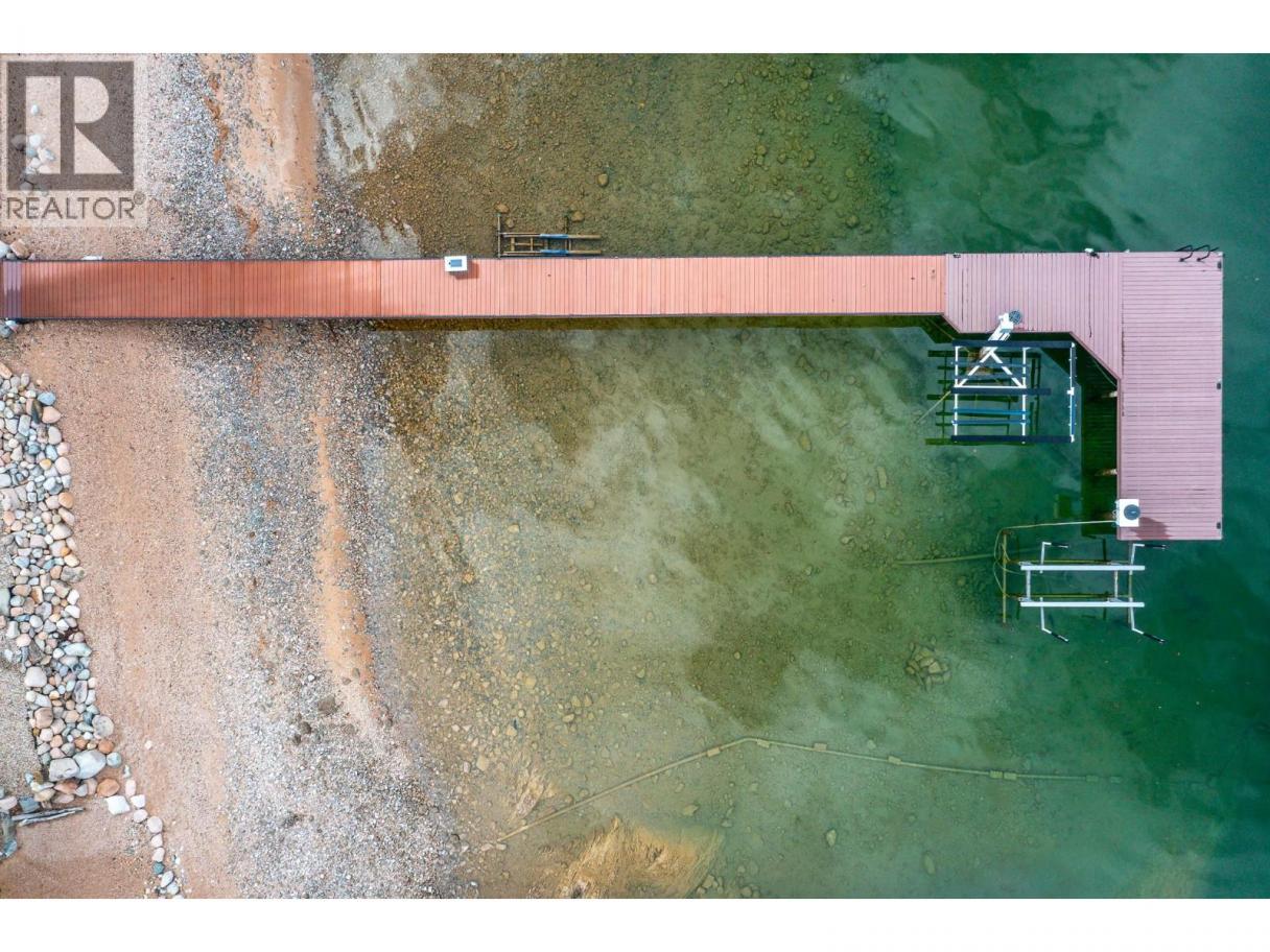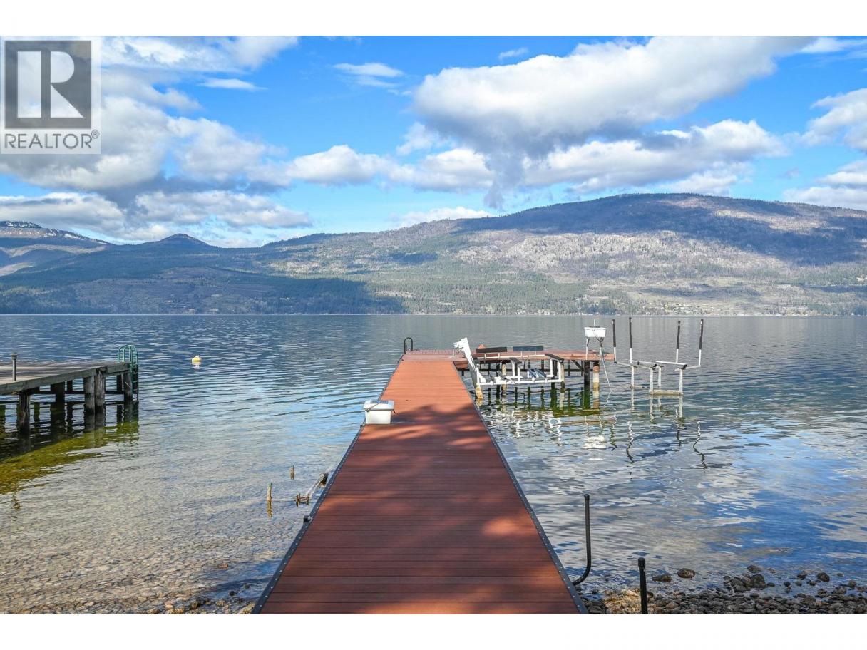 Exceptional Okanagan Lakefront living in this beautifully designed 4 bed, 5 bath home built in 2019. Thoughtfully set up for summer enjoyment and entertaining, this property offers 75 ft of waterfront and a lifestyle built around fabulous Okanagan Lake . The deluxe dock includes steel piles, composite decking, boat lift, and Sea-Doo lifts, making lake days effortless. Dive into the deep refreshing waters, lounge along the shore, or enjoy your private hot tub to unwind after a day on the lake. A spacious outdoor patio anchors the home with seating, firepit, and BBQ space—ideal for hosting family and friends while taking in the views. Inside, the upper level features a stunning primary suite with high ceilings, private lakeview deck, 5-piece ensuite, and walk-in closet. A generous guest room with double bunk beds provides excellent space for children or visitors, with dual sinks in the ensuite for convenience. The lower level offers open-concept living with kitchen and family room, both opening to a covered patio through sliding glass doors. Two additional bedrooms each feature their own ensuite, offering comfort and privacy throughout. Elevated for optimal views yet just steps to the water, this home blends luxury and lakeside ease. Located in the gated Cliffshore Estates community just south of Vernon, it offers privacy and tranquility while remaining minutes to amenities like Ellison Provincial park and miles of bike trails. (id:6769)