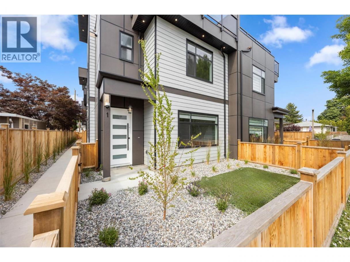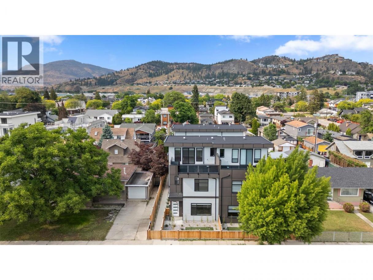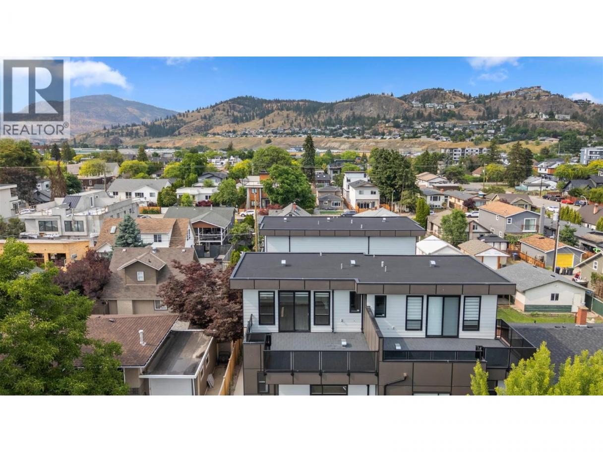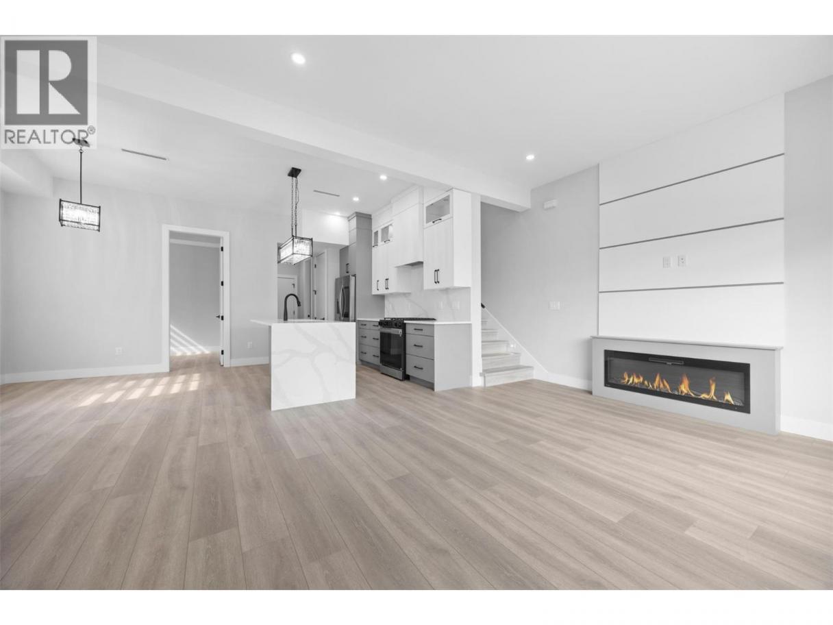 An entertainer's dream; this detached townhome (no shared walls) features something most townhomes don't have; an added a 350 sq ft third floor (with wet bar) that opens to an expansive patio. What you do with this space is your empty canvas to explore. From a games room, to a toy room for the kiddos, or a big screen with projector (a golf sim maybe), a super chic dining area; a gym or yoga studio…you’ve got options that other infill units don’t have. The main floor enters into a great room with an electric fireplace and feature wall, a dining area and kitchen with waterfall edge quartz countertops; a wireless fridge with screen, and a gas stove. The builder also saw some extra space and decided to add a full bathroom to the main, which fits perfect with the bedroom for guests or extended family. A private and fenced back yard patio completes this easy living main level and gives room for your dogs to sun themselves before you hike up Knox Mountain. The stair case up features built in lighting leading you to 3 more bedrooms up, including the primary with his and hers walk in closets and a well-appointed ensuite. On this level you will also find your laundry area and another full bath. On the third level you will find the aforementioned bonus space, where you can sip your favourite beverage, stare out at the adjacent park area and green space, and contemplate which downtown restaurant or beach you will hit up as the sunsets. This townhome is well thought out, well appointed, well built, and waiting for you to come and have a look. (id:6769)