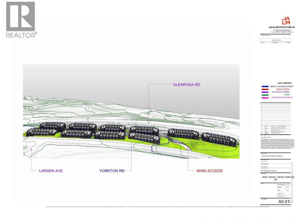 Prime multifamily development opportunity in the rapidly growing Glenrosa neighbourhood of West Kelowna. This 3.435-acre site (Yorkton Rd – Lot 28) is zoned R3 – Low Density Multiple Residential, offering an excellent foundation for a thoughtfully designed townhome project. Preliminary architectural planning supports a 79-unit townhome development featuring a mix of 3-bedroom and 2-bedroom homes, many with rooftop patios with immaculate views and garage parking. The proposed plan includes approximately 223,439 sq.ft. of gross floor area with efficient site coverage (~36%) and a density of 1.47 FAR, maximizing land use while maintaining livability. The site benefits from direct access off Yorkton Road, with proximity to parks, schools, and established residential communities. Servicing include gravity-fed sanitary systems, underground stormwater detention, and access to three-phase power, supporting streamlined development potential. Topography offers moderate slopes, allowing for creative architectural design while remaining more cost-effective relative to surrounding sites. Preliminary analysis suggests standard excavation and grading requirements with retaining walls anticipated. Conceptual plans and site analysis provide a strong basis for development permit advancement. This is a compelling opportunity for builders and developers seeking scale, design flexibility, and strong end-user demand in one of West Kelowna’s most active growth corridors. (id:6769)